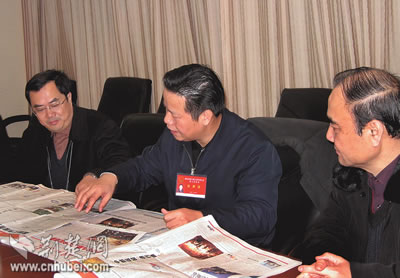 張昌爾說,各新聞單位高度重視“兩會”報道,會前充分準備,作了周詳計劃。會中派出精兵強將,全力以赴。報紙、電視、廣播的報道各自亮點頻出,手法多樣,可讀性可視性可聽性大大增強,較好地反映了代表委員參政議政的風采。他希望參加“兩會”報道的新聞工作者繼續(xù)努力,更多地關注基層代表委員的聲音,報道他們在社會主義民主制度建設中發(fā)揮的作用,為重大政治性戰(zhàn)役報道落實“三貼近”原則積極探索。圖為張昌爾在評點湖北日報“兩會在線”。