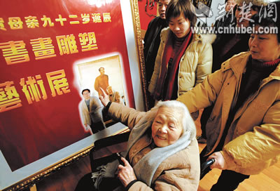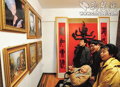 “這是特意為您準(zhǔn)備的生日禮物!”年過六旬的盧永瀚攙扶著92歲的母親,在根雕、油畫面前仔細(xì)講解!斑@個根雕是壽字!”孫女插話說:“就是祝您長壽,活過100歲!”慧老太太邊看邊比劃著,樂得合不攏嘴,用濃重的江浙口音說:“好、好!”