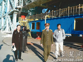 發(fā)射完畢后,酒泉衛(wèi)星發(fā)射中心參謀長吳年生帶領(lǐng)湖北老鄉(xiāng)參觀發(fā)射架。本報通訊員李福元攝