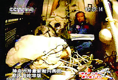 中午12時(shí)35分,神舟六號(hào)飛船正飛越我國(guó)上空,在雷鳴般的鞭炮聲中,慶祝航天英雄聶海勝41歲生日的儀式正式開(kāi)始,中央電視臺(tái)同步直播。