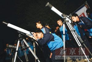 13日凌晨6時(shí),平谷一中學(xué)的天文愛(ài)好者使用天文望遠(yuǎn)鏡等待神六出現(xiàn)。