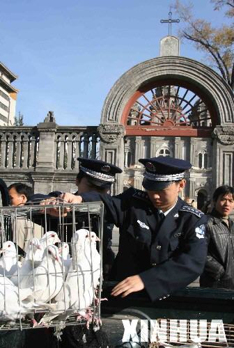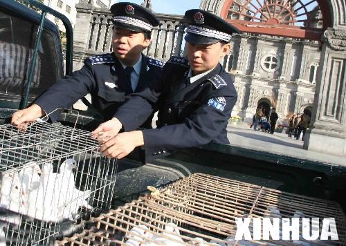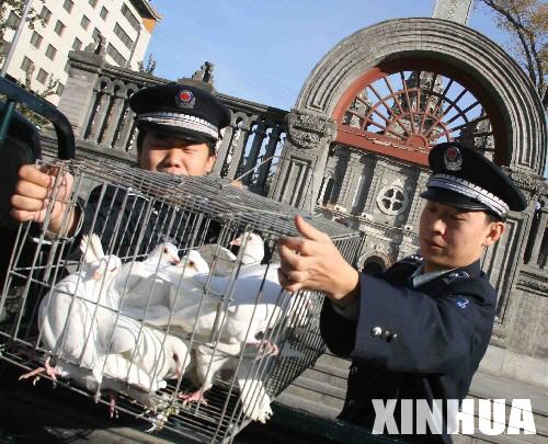 11月15日,北京市東城區(qū)城管隊員在王府井教堂的廣場前拉起一張捕鳥網,捕捉廣場附近的野鴿子。這些野鴿子將被送到信鴿協(xié)會在昌平設立的鴿舍,待禽流感疫情解除后,再放回廣場。 新華社發(fā)(吳強 攝)