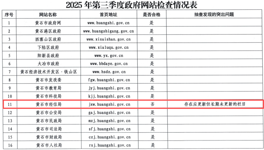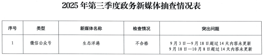荊楚網(wǎng)(湖北日報網(wǎng))訊(記者 呂鑒蕾)記者24日獲悉,日前,黃石市政務(wù)服務(wù)管理局組織開展了2025年第三季度全市政府網(wǎng)站與政務(wù)新媒體檢查。其中,黃石市經(jīng)信局官網(wǎng)和“生態(tài)洋港”公眾號因日常維護(hù)管理不到位被點名。