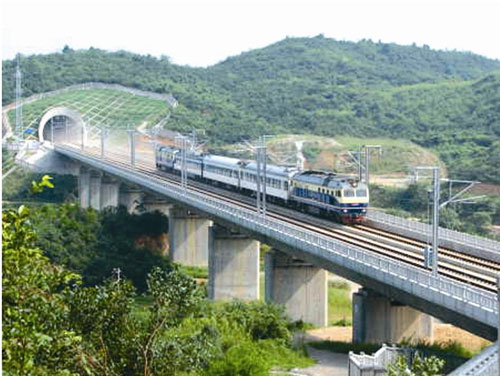 大瑤山位于湘粵交界之處,素有“南嶺險關(guān)”之稱。上世紀(jì)80年代,修建衡陽到廣州復(fù)線,建設(shè)者用7年時間在這里修建隧道,全長14公里,是當(dāng)時國內(nèi)最長的雙線電氣化隧道。這次,武廣客專的方案是修建隧道群,由1號、2號、3號隧道組成,橋隧相連。3條隧道全長25公里,用了3年半全部竣工。