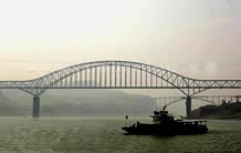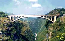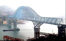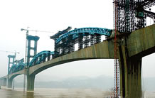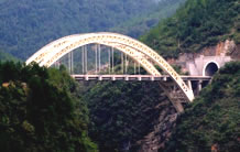 湖北宜萬鐵路野三河大橋位于湖北省恩施州建始縣與巴東縣交界處,它是一座主跨為124米不對稱雙線平行雙肋中式復(fù)合鋼管混凝土桁架坡拱橋,由中承式拱橋和下承式拱橋兩部分組成,這種不對稱坡拱橋在國內(nèi)尚屬首例。該橋由湖北省交通規(guī)劃設(shè)計院設(shè)計,于2006年3月份開工,2007年1月成功合龍。