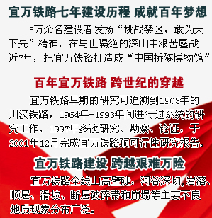 宜萬鐵路開建可以追溯到1909年12月10日,其前身是川漢鐵路,最早由詹天佑主持修建,從宜昌往秭歸修了20多公里就被迫停工。直到2003年,鐵路才重新開工。從2003年12月開工至2010年8月18日宜萬鐵路全線鋪軌貫通,耗時七年,377公里的宜萬鐵路平均每年建成里程僅50多公里,成了國內(nèi)修建時間最長鐵路。