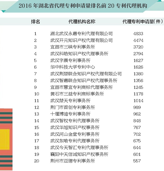 2016年湖北省代理專利申請量排名前20專利代理機構(gòu)