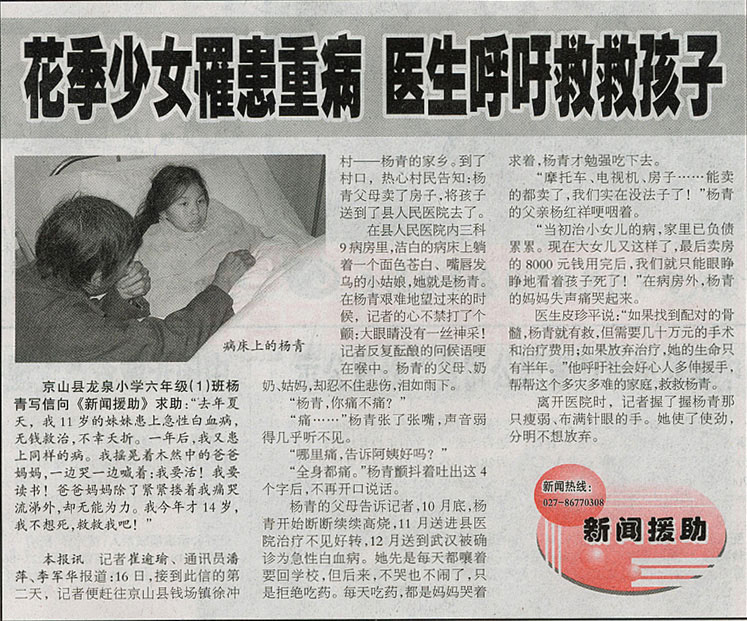 京山縣一對(duì)先后患上急性白血病的少女,妹妹已于一年前不幸夭折,姐姐楊青在死亡線上苦苦掙扎。父母為治療姐妹倆的病,花光了所有積蓄,仍不能湊夠移植骨髓所需的幾十萬(wàn)元手術(shù)和治療費(fèi)用,已經(jīng)陷入絕望。但是,才14歲的楊青不肯向悲慘的命運(yùn)妥協(xié),她寫(xiě)信給報(bào)社:“我不想死,我要讀書(shū),救救我吧!”