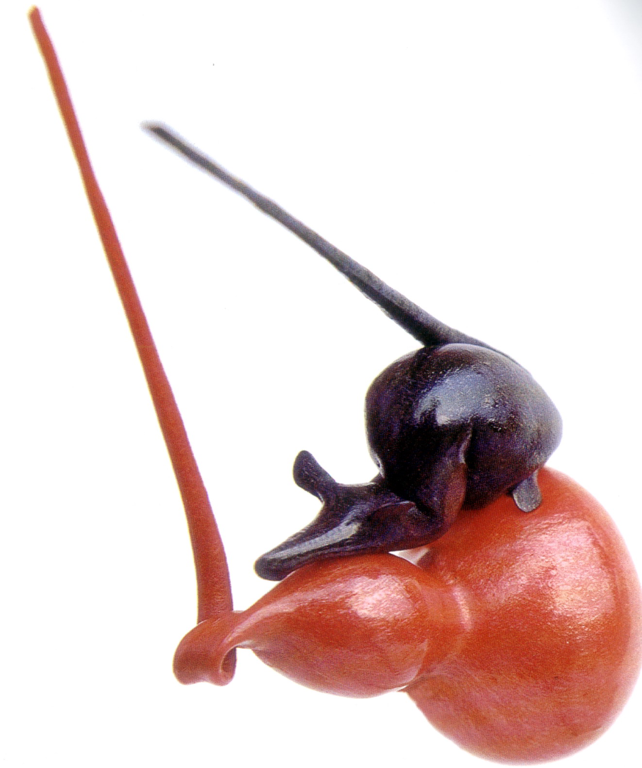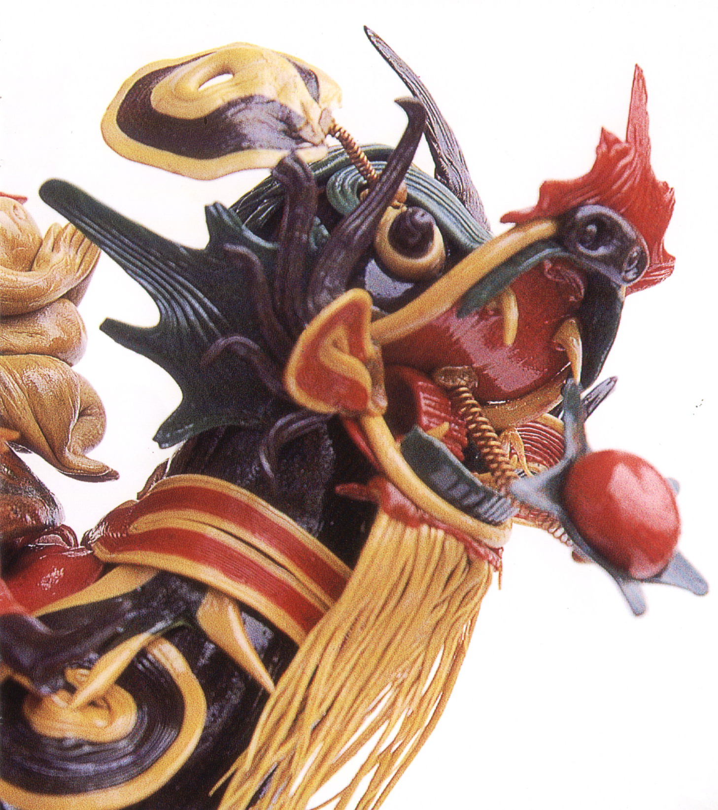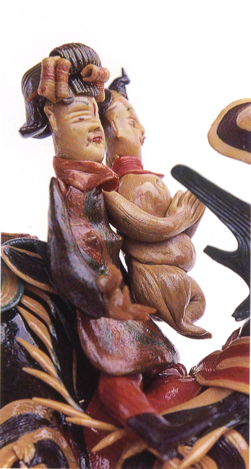 糖塑,俗稱吹糖,在湖北遍及全省,尤以天門最為突出。糖塑之所以贏得人們的喜愛,是因為它獨具特色:1、原料可塑性強:麥芽糖是糖塑的主要原料,加熱后變軟,比面塑更具可塑性,既可吹成薄而亮的各類造型,又可拉成粗細不同的糖絲。捏成不同形狀的配件,易粘且牢固;2、造型神形兼?zhèn)洌禾撬艿募妓囍饕Ψ蛟凇按怠鄙希粔K糖坯在藝人手中,邊吹邊捏,再通過搓、壓、挑、剪等手段,加上輔助的小鐵絲,少則幾分鐘,多則半小時,一件作品就完成了;3、色彩和諧醒目:麥芽糖加溫變軟加入紅、綠、黃、黑四種色素,根據(jù)需要又可調和成數(shù)十種復色,色彩響亮和諧;4、肌理變化豐富是糖塑獨具的特點:在糖塑中,附件變化萬千的肌理又與主體吹成光滑的表面形成鮮明的對比,顯得更加豐富耐看;5、“活”的部件是糖塑的又一特點:有的部件裝上自制的鋼絲彈簧,一經(jīng)拿在手中,部件都“活”起來了,更具生氣。